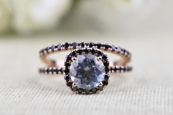 7mm Round Aquamarine Black Diamond Halo Engagement Ring Etsy Uk
